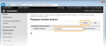 Önceden paylaşılan anahtar için en fazla 24 alfasayısal karakter girin ve [Tamam] öğesini tıklatın.