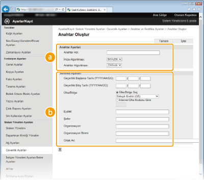 Aktarım Katmanı Güvenliği (TLS) aracılığıyla şifrelenmiş iletişim için gerektiğinde, makine ile bir anahtar çifti oluşturulabilir. Makineye Uzak Kullanıcı Arabirimi aracılığıyla erişirken TLS'yi kullanabilirsiniz. Makineye en fazla beş anahtar çifti kaydedilebilir.