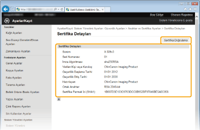 Anahtar çiftleri ve CA sertifikaları kaydedildikten sonra, bunların ayrıntılı bilgilerini görüntüleyebilir veya geçerlilik ve imza için bunları doğrulayabilirsiniz.