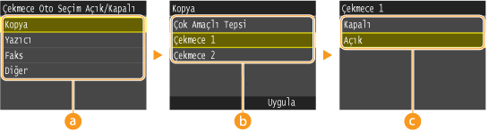 "*2" ile işaretli ayarlar yalnızca isteğe bağlı Kaset Besleme Ünitesi veya Kaset Modülü takıldığında kullanılabilir.