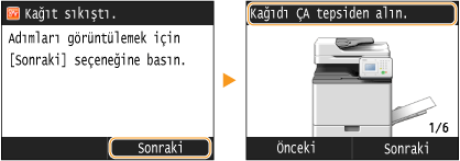 Ekranda görüntülenen kağıt çekmecesinden başka bir konumda kağıt sıkışmış olabilir. Her bir çekmeceyi çekin ve sıkışmış kağıt olup olmadığını kontrol edin.