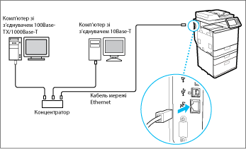 Підключіть апарат до комп’ютера за допомогою маршрутизатора. Підключіть апарат до маршрутизатора за допомогою кабелю локальної мережі.