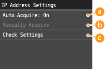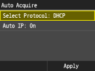 ![]() ![]() Відмова призначати IP-адресу за допомогою протоколу DHCP Виберіть значення <Off>. Якщо вибрати пункт <DHCP>, коли ця послуга недоступна, апарат лише витратить час і комунікаційні ресурси на пошук мережі для отримання цієї послуги. |