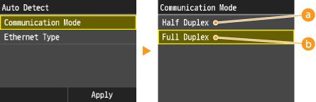 <Half Duplex> або <Full Duplex>.![]() <Half Duplex>Почергове надсилання й отримання даних зв’язку. Виберіть, коли апарат підключатиметься до мережевого пристрою, використовуючи напівдуплексний режим.