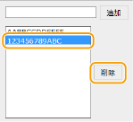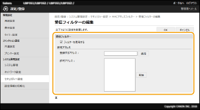 2 | 例外アドレスを設定する [登録するアドレス]にMACアドレスを入力し、[追加]をクリックします。 アドレスは「-」(ハイフン)や「:」(コロン)で区切らずに入力してください。 ![]() 入力内容をよくお確かめください MACアドレスを間違えて設定すると、リモートUIからアクセスできなくなることがあります。この場合は、操作パネルから<MACアドレスフィルター>を<OFF>にしてください。<MACアドレスフィルター> ![]() 設定したMACアドレスを削除するとき 削除するMACアドレスを選び、[削除]をクリックします。 ![]() |