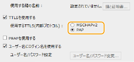 1 | [TTLSを使用する]または[PEAPを使用する]にチェックマークを付ける TTLSを使用する場合の内部プロトコル MSCHAPv2またはPAPを選択できます。 |