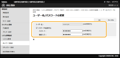 3 | ユーザー名やパスワードを設定する [ユーザー名] ユーザー名を半角英数字で入力します。 [パスワードを変更する] パスワードを設定または変更するときはチェックマークを付け、[パスワード]と[確認入力]の両方に同じパスワードを半角英数字で入力します。 |