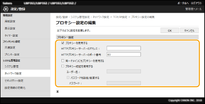 チェックマークを付けると、本機がHTTP通信するときは指定したプロキシーサーバーが使用されます。
