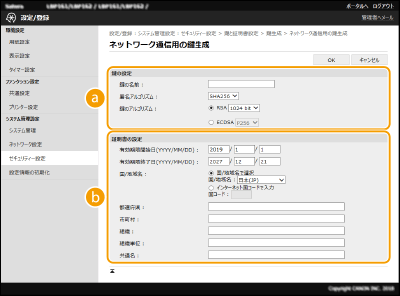 Transport Layer Security(TLS)を使った暗号化通信に必要な鍵と証明書を生成できます。TLSは、リモートUIを使って本機にアクセスするときに使用できます。「ネットワーク通信用」に生成した鍵と証明書では自己署名証明書が使われます。