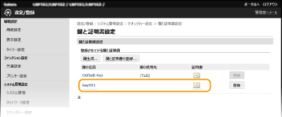 使用中の鍵と証明書には「TLS」や「IEEE 802.1X」などの使用目的が表示され、この状態では削除できません。目的の機能を解除するか、別の鍵と証明書に変更してから削除してください。