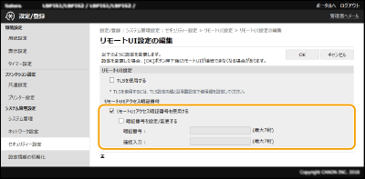 チェックマークを付けると、リモートUIにアクセスするときに暗証番号の入力が必要になります。