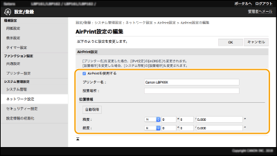 本機を識別するための名称や設置場所を設定します。AirPrintを使用できないように設定することもできます。設定はリモートUIを使って行います。