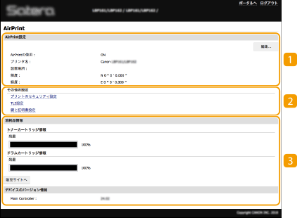 管理者権限でログインすると、次のAirPrint専用ページが表示されます。
