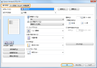 プリンタードライバー画面の[ヘルプ]をクリックすると、ヘルプ画面が表示されます。ユーザーズガイドに記載されていない項目の詳しい説明については、ヘルプを参照してください。