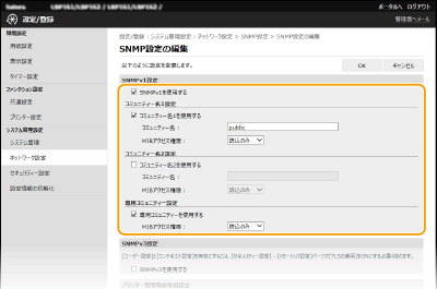 専用コミュニティーはキヤノンのソフトウェアを使用する管理者用に用意されたコミュニティーです。専用コミュニティーを使用するときはチェックマークを付け、[MIBアクセス権限]を指定します。使用しないときはチェックマークを外してください。