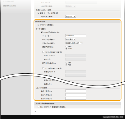 SNMPv1を使用しないときプリンタードライバーによる本機からの情報取得など、一部の機能が使用できなくなります。 操作パネルで設定するとき<メニュー>からSNMPv1設定を行ったり、SNMPv3設定を有効/無効に切り替えたりすることもできます。 <SNMP設定> |