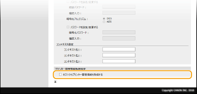 SNMPを使って本機のプリンター管理情報を監視するときはチェックマークを付けます。監視しない場合はチェックマークを外してください。