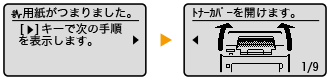 を押すと簡易的な対処方法が表示されます。画面を見ても対処方法がわからないときは、以下の参照先を確認し、つまった紙を取り除いてください。