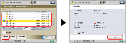 メモリーメディア内のファイルの詳細情報(ファイル名、場所、更新日時)を確認できます。
