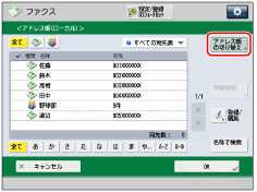 [アドレス帳の切り替え]は、リモートアドレス帳とLDAPサーバーが登録されているときに表示されます。リモートアドレス帳のみが登録されているときは[リモートへ]が表示されます。 |