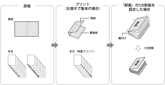 [左開き]: | 左開きになるように割り付けて製本します。 |