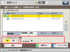 [ファンクション設定](設定/登録)の[受信トレイ設定]にある[メモリー受信開始時刻]/[メモリー受信終了時刻]を設定した場合、次のように表示されます。 <I ファクスメモリー受信>を[ON]:メモリー受信を終了する時刻が表示されます。 <I ファクスメモリー受信>を[OFF]:メモリー受信を開始する時刻が表示されます。 メモリー受信ボックス内のIファクス受信ファイルは、<I ファクスメモリー受信>を「OFF」に設定するとプリントされ、メモリーから削除されます。 |