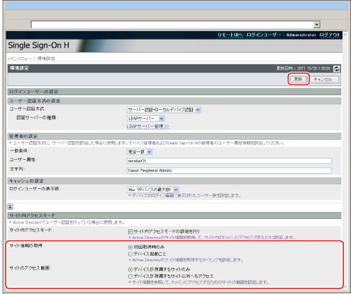 [デバイスが所属するサイト以外へもアクセス]: | 本体が所属するサイトにドメインコントローラーが存在しない場合は、サイト外のドメインコントローラーにもアクセスします。サイト外にもドメインコントローラーが存在しない場合、エラーが発生します。 |