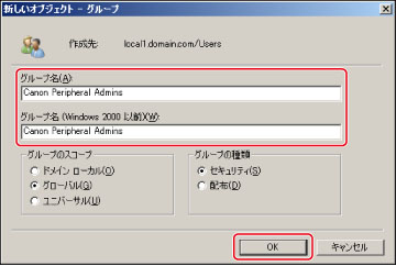 [新しいオブジェクト-グループ]ダイアログボックスで、グループ名(Canon Peripheral Admins)を入力→[OK]をクリック