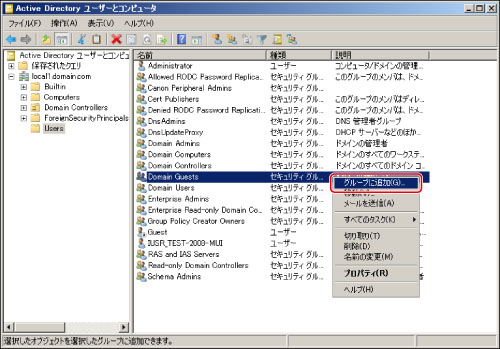 「Canon Peripheral Admins」グループに所属させたいユーザーのアカウントを右クリック