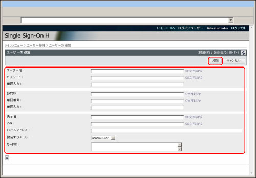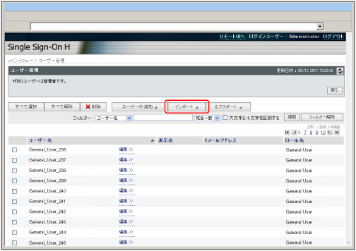 登録できるユーザー数は最大5,000 件までです。 ユーザー名は変更できません。 ログイン中のユーザー情報を編集した場合、変更内容はログアウトしたあとに反映されます。 ユーザー名を変更する場合は、一度ユーザー情報を削除し、新規にユーザー情報を登録しなおす必要があります。 システムアドミニストレーター(Administrator)としてログインしているユーザー情報は削除できません。 インポートするユーザーは、一般ユーザーとして登録/上書きされます。 ユーザータイプは、すべて一般ユーザーとして保存されます。 |