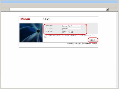 ローカルデバイス認証の一般ユーザーのユーザー名、パスワードを入力→ログイン先に[このデバイス]を選択→[ログイン]をクリック