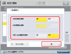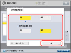 リモートUI、IPP印刷、BMLinks、WSD印刷、WSD Scan、部門別ID管理の暗証番号確認を使用するときは、[ON]を押します。