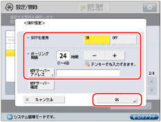 プロキシー認証を使用する場合は、[認証設定]を押したあと、<プロキシー認証を使用>の[ON]を押してください。[ユーザー名]を押して、プロキシー認証で使用するユーザー名を入力したあと[OK]を押してください。[パスワード]を押して、プロキシー認証で使用するパスワードを入力したあと[OK]を押してください。確認入力画面で同じパスワードを入力したあと、[OK]を押します。