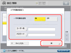 ファイアウォールを介してインターネットに接続している場合にもFTPによるファイル転送を利用したいときは、[ON]を押します。