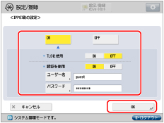 IPP認証機能を使用するときは、<認証を使用>の[ON]を押します。[ユーザー名]を押して、IPP認証で使用するユーザー名を入力したあと[OK]を押してください。[パスワード]を押して、IPP認証で使用するパスワードを入力したあと[OK]を押してください。確認入力画面で同じパスワードを入力したあと、[OK]を押します。