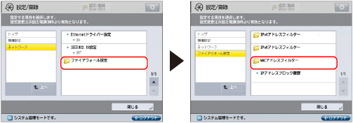 [MACアドレスフィルター]の[送信フィルター]または[受信フィルター]→<フィルターを使用>の[OFF]を押す