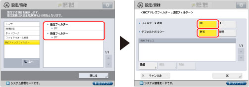 [MACアドレスフィルター]の[送信フィルター]または[受信フィルター]→<フィルターを使用>の[ON]→ <デフォルトポリシー>の[許可]を押す