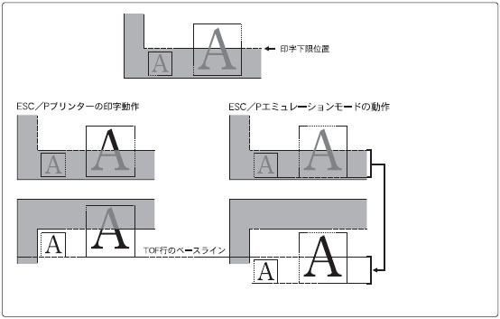 ESC/Pエミュレーションモードでは、ESC/Pプリンターとほぼ同じ印字動作を行うために、ESC/Pプリンターの用紙エンド(用紙の下端)に相当する位置が用紙サイズごとに決められています。