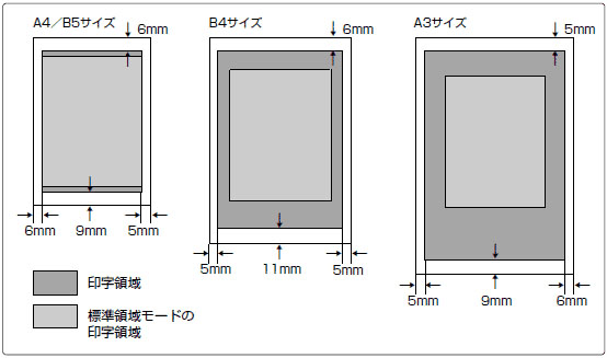 A4サイズでは、標準領域モードでページフォーマットの印字領域と用紙の有効印字領域にあまり差がないため、ワイド領域モードにしてもあまり効果がありません。