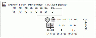 | ヘキサ形式とは、1バイト(8ビット)のデータを示すコード(16進数のバイナリ形式データ)を、上位と下位に分けて2バイト分の文字形式(アスキーコードの0~9およびA~F)で表します。 たとえば、制御命令 ESC ℓ (総バイト数3)を使用して、左マージンを8桁目に設定する場合、次のようなヘキサ形式のデータとなります。 |