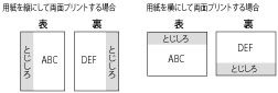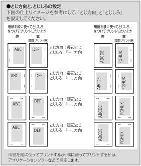 とじる位置を、用紙の長い辺にするか短い辺にするかを設定します。両面プリントをしてとじるときには、表面と裏面とで、とじしろの位置が自動的に調整されます。