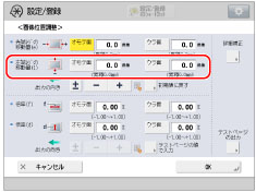 [OK]を押して画面を閉じた後に再び開くと、画面上の数値は「0」に戻っていますが、入力した調整値は「累積」の欄に保持されます。調整を繰り返す場合は、新たに出力したテストページ上で「i」の長さを確認し、調整値を算出して入力してください。 |