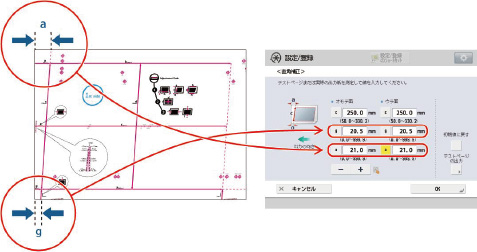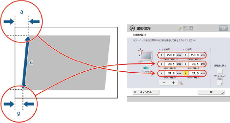 ここで例にあげた出力紙の場合、[c]を250.0に、[g]を20.5に、[a]を21.0にします。差分である0.5 mmの傾きが補正されます。