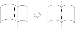 この機能は、担当サービスによって設定が開放されている場合にのみ表示されます。表示されている場合も、管理者以外は設定変更しないでください。設定を変更する場合の操作方法については担当サービスにお問い合わせください。 中とじ位置、折り位置のどちらも用紙中心からずれている場合には、[中とじ折り位置の調整]で折り位置を中とじ位置と合うように調整してから、[中とじ位置変更]で中とじ位置、折り位置を調整してください。[中とじ折り位置の調整]は折り位置のみが調整され、[中とじ位置変更]は中とじ位置、折り位置の両方が調整されます。中とじ位置の調整については、「中とじ位置を変更する」を参照してください。 |