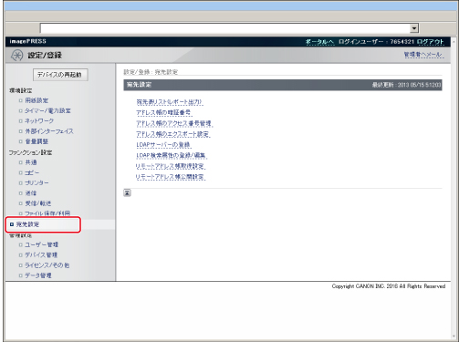 サーバー(LDAP)の設定は、本体操作パネルの (設定/登録)→[宛先設定]→[LDAPサーバーの登録]からも行えます。操作パネルから行う方法については、「LDAPサーバーの設定をする」を参照してください。LDAPサーバーの設定をする場合は、管理者としてログインする必要があります。 |