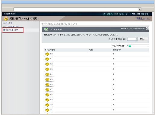 [受信/保存ファイルの利用]→[ファクスボックス]をクリック→ボックス番号を選択