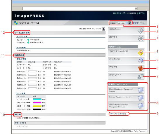 トップページの表示言語で言語を変更すると、本製品の操作パネルで使用している言語に関係なく、画面に表示される言語を切り替えることができます。 トップページで表示言語を切り替えたとき、本製品の操作パネルで設定している言語と異なる場合は、表示言語が正しく表示されないことがあります。 [環境設定] (設定/登録)→ [表示設定]の[表示言語/キーボードの切替]を「ON」に設定すると、入力できる文字が制限されることがあります。 |