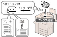 受信したIファクス文書をプリントせずに、システムボックスに保存するように設定できます(メモリー受信)。システムボックスにメモリー受信された文書は、相手先やページ数などの詳細情報を確認したあと、好きなときにプリントしたり、別の宛先に再送信したりできます。