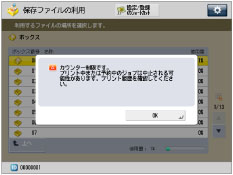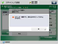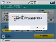 (クリア)を押すと、入力した数字を取り消すことができます。 制限面数の入力範囲は0~999999です。設定した数値を超えるコピー/スキャン/プリントはできません。制限面数に達した場合、次のような画面が表示されます。 コピー中 送信時の原稿読み込み中 プリント中 |