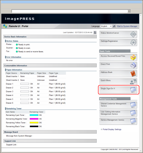 To log in from the Remote UI Portal, set [Remote UI] in [License/Other] in [Management Settings] (Settings/Registration) to 'On'. (See "Before You Start the Remote UI.")